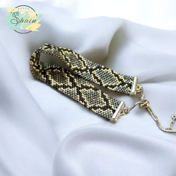 منجوقهای میوکی ژاپنی به دلیل یکدست بودن، کیفیت سطح بالا و درخشندگی خاص، بین هنرمندان ساخت زیورآلات بسیار محبوب هستند. در این محصول نیز بهصورت حرفهای و با چیدمان دقیق در کنار یکدیگر قرار گرفتهاند تا طرح پوست ماری به بهترین شکل برجسته شود. ترکیب رنگها با دقت انتخاب شده و هارمونی ایجادشده باعث شده این دستبند نهتنها زیبا، بلکه بسیار چشمنواز باشد.