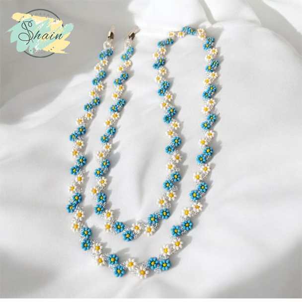 این بند عینک دارای طراحی شکوفهای ظریف است که آن را از سایر بندهای معمولی متمایز میکند. استفاده از رنگهای زیبا و چشمنواز در کنار ترکیب مهرههای میوکی باعث شده تا این بند، انتخابی شیک و منحصربهفرد باشد.
