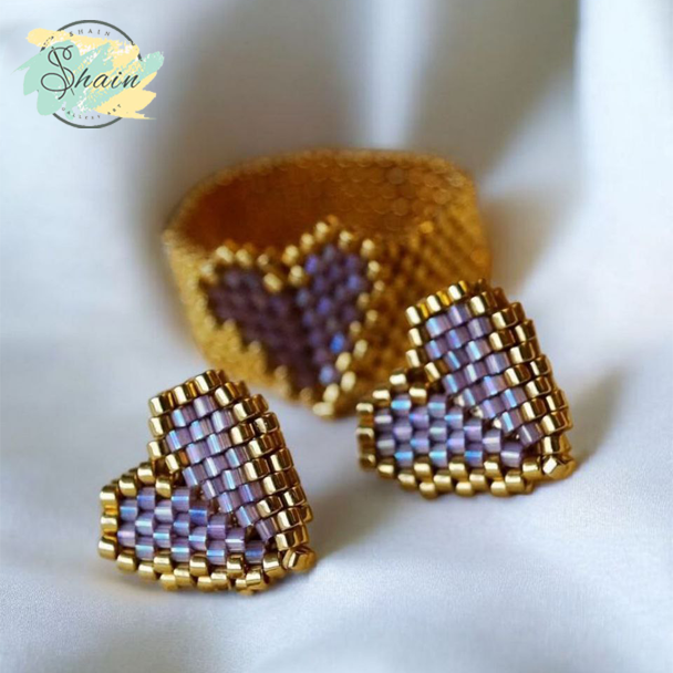 نیم ست انگشتر و گوشواره میخی طرح قلب طلایی کد 3114 | زیورآلات دستساز با منجوق میوکی ژاپنی | شاین گالری